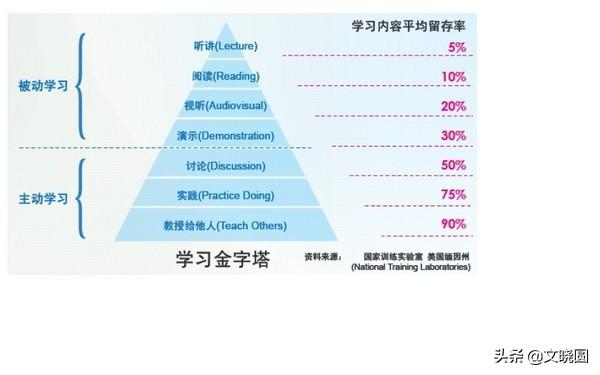 通过这个金字塔我们可以了解到,被动学习的平均学习内容留存率是整体低于主动学习的,而主动学习的最有效方式则是教授他人。
