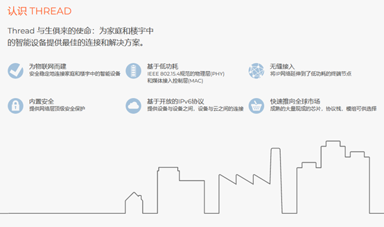 Thread是一种可靠、安全且超低功耗的网络协议,它可提供快速的响应时间、更大的覆盖范围和长达数年的电池续航时间,从而用以提升连接体验。作为一种基于IP的开放标准,Thread支持将诸如照明设备、调温器、门锁、传感器和智能扬声器等家庭自动化设备安全、可靠、便捷地集成到智能家居或建筑中,并直接连接到云端。