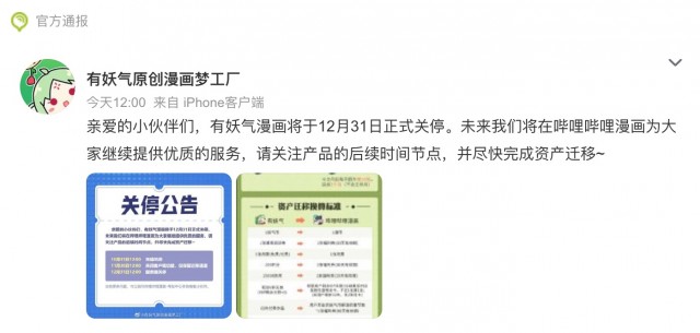 9月1日消息,有妖气漫画微博发布消息称,有妖气漫画将于12月31日正式关停。未来将在哔哩哔哩漫画为用户继续提供优质的服务,用户可关注产品的后续时间节点,并尽快完成资产迁移。