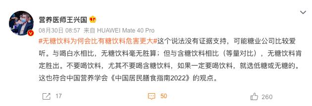 不仅如此,还有一些营养师博主在话题下面指出,这个说法没有证据支持,与喝白水相比,无糖饮料毫无胜算;但与含糖饮料相比(等量对比),无糖饮料肯定胜出。不要喝饮料,尤其不要喝含糖饮料,如果一定要喝饮料,就选低糖或无糖的。