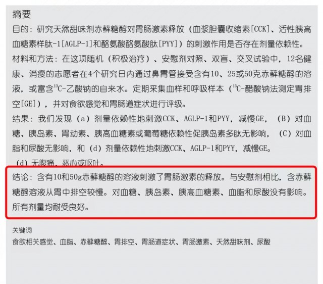 《Wiley》期刊杂志发表的赤藓糖醇研究论文-《含有天然甜味剂赤藓糖醇的溶液的胃排空及其对人体胃肠激素分泌的影响:初步剂量范围研究》指出,赤藓糖醇摄入对血糖、胰岛素、胰高血糖素、血脂或尿酸浓度没有影响。这些特性的结合使得赤藓糖醇成为一种有吸引力的糖替代品,特别是在代谢脆弱的人群中—肥胖和糖尿病患者。
