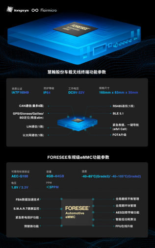 产品配合内置的FORESEE车规级eMMC(Grade3),让设备拥有高耐久、高速响应、完整准确的数据存储性能,在-40℃~85℃的极端恶劣环境下依然能够实现车辆远程监控、远程控制、安全监测和报警、远程诊断等多种在线车联网应用,为用户提供更安全便捷的驾驶体验。