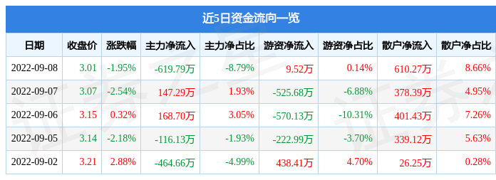 资金流向数据方面,9月8日主力资金净流出619。79万元,游资资金净流入9。52万元,散户资金净流入610。27万元。